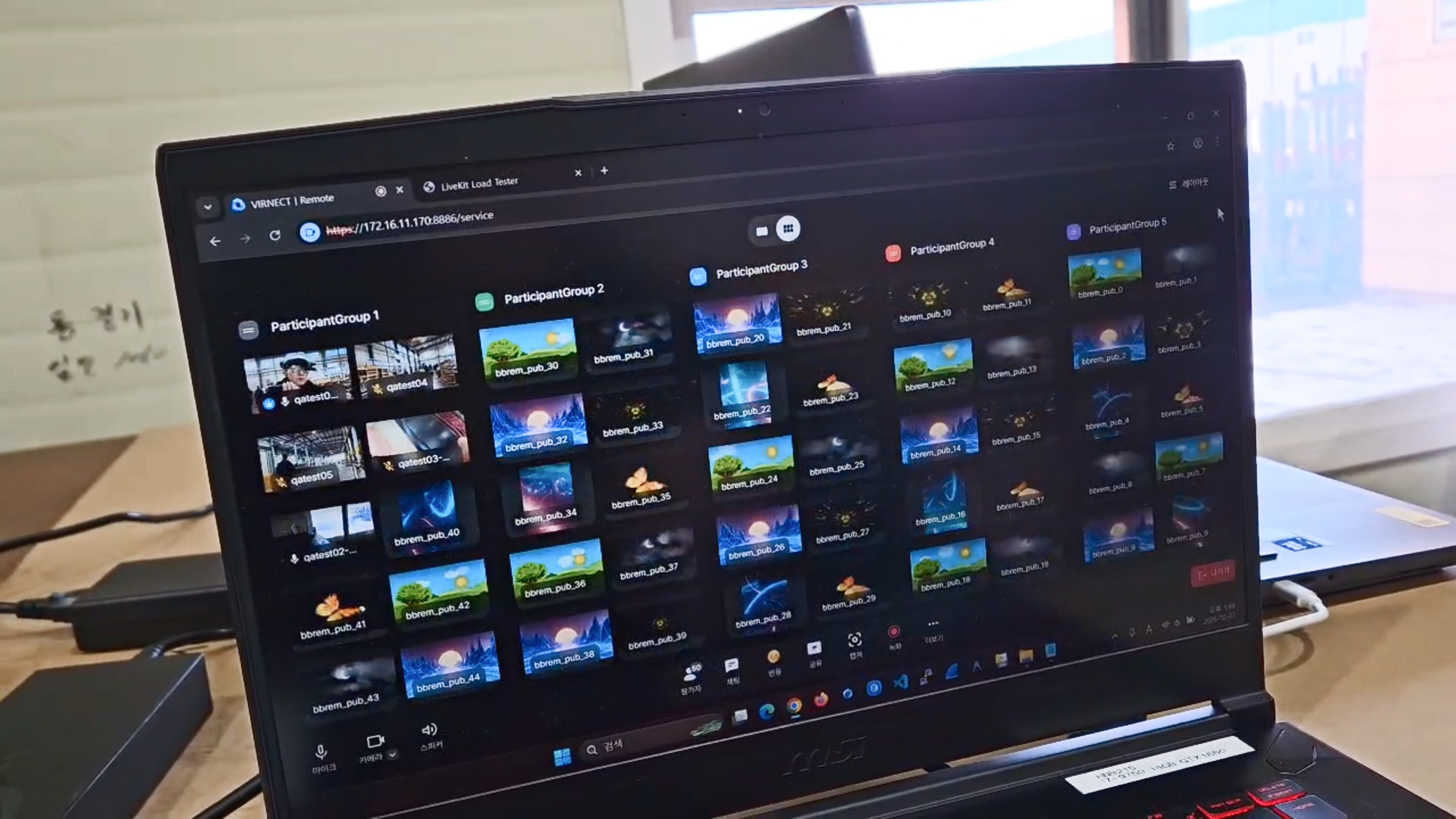 버넥트는 실제 관리자 1명과 Livekit-CLI로 생성한 더미 사용자 50명을 동시에 발생시켜 51인 동시 접속 환경을 시뮬레이션했습니다. 이 테스트는 실제 서비스 서버(20코어 / RAM 32GB)보다 낮은 사양의 테스트 서버(8코어 / RAM 16GB)에서 진행됐습니다. 검증 결과 패킷 손실률은 전체 평균 0.011%(최대 0.066%)였으며, 참가자 100% 접속 유지, 통신 에러 0건을 기록했습니다. 총 처리 대역폭 240.4Mbps 환경에서 사용자 1인당 평균 수신 대역폭은 4.8Mbps였습니다.