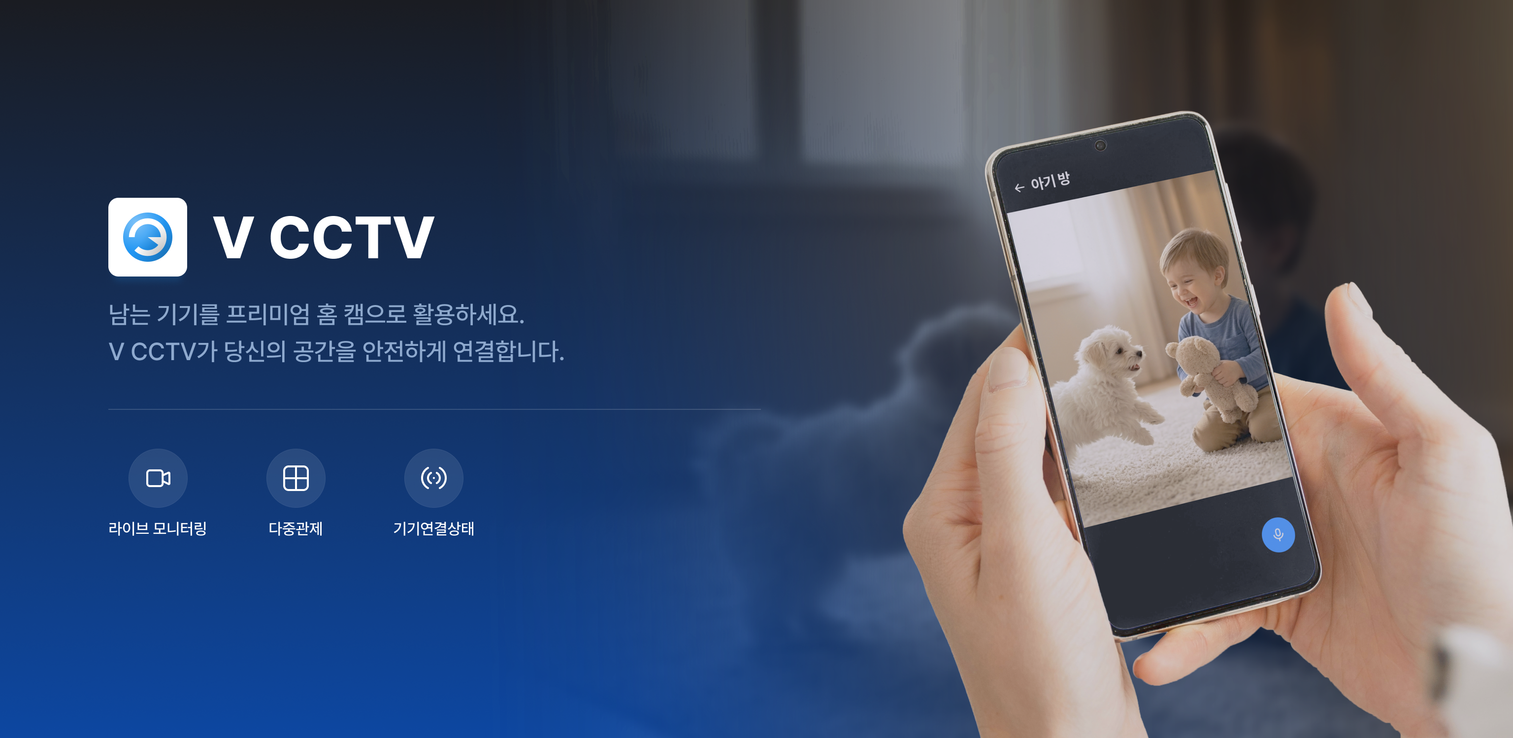 V CCTV는 현재 구글 플레이스토어에서 무료로 다운로드할 수 있습니다. 추가 장비 구매 없이, 지금 가지고 있는 스마트폰으로 시작할 수 있습니다.