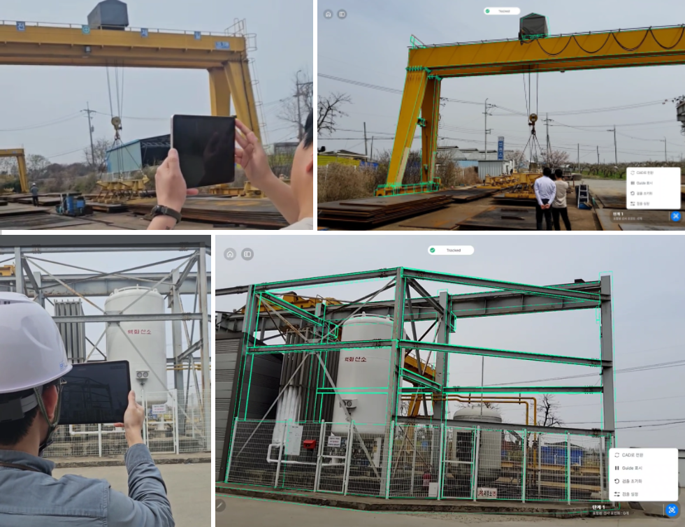VIRNECT Inspect는 설계 도면 기반 3D 모델을 실물에 겹쳐 맞춰, 태블릿 하나로 제작 오차와 누락을 현장에서 바로 확인할 수 있는 AR 검사 솔루션입니다. 버넥트는 신원스틸 현장에서 골리앗 크레인, 수소탱크, 태양광 패널 등 다양한 대형 구조물을 대상으로 실증을 진행했습니다. 태블릿 화면 안에 구조물 전체가 들어오는 환경에서 3D 모델이 실물 위에 안정적으로 유지됨을 확인했습니다.