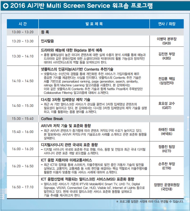 2016년 11월 23일 한국과학기술회관에서 열린 한국통신학회 주최 AI기반 Multi Screen Service 워크숍에서